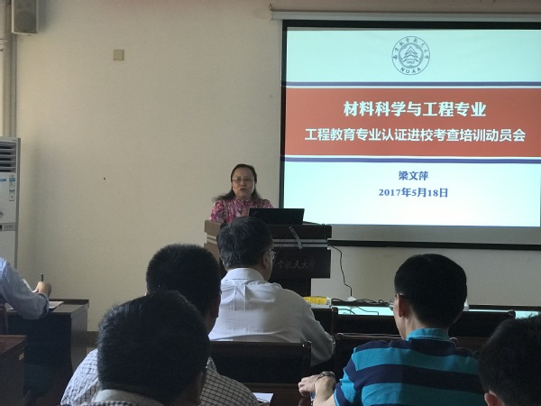 梁文萍从前期工作总结、总体要求及流程、进校前对专业的要求、现场考查中对专业的要求、其他有关要求等五个方面进行了培训和动员。材料科学与工程专业在兄弟院校调研基础上,2016年12月20日申请正式受理,进入自评阶段。进入自评阶段后,认证小组先后赴北京、沈阳参加培训;院内召开了5次培训研讨会,包括专业教育认证启动暨培训会、认证任务分解及工作布置会、毕业要求12条与课程支撑关系讨论、教学大纲修订现场会、达成度讲评现场会;同时邀请校内外专家进行3次专家辅导;自评报告撰写组召开10余次研讨会。最终于3月15日完成自评报告初稿,并于4月15日修改完善。