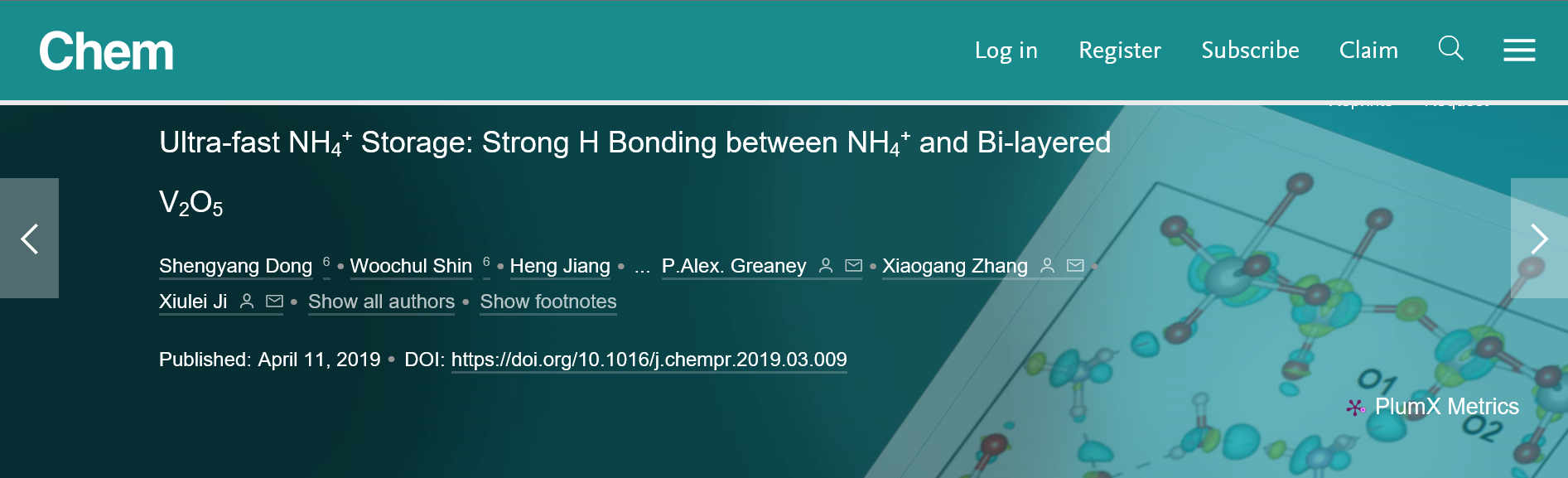 近日,我校英国上市365张校刚教授课题组与美国的俄勒冈州立大学、加州大学河滨分校、阿贡国家实验室等中美联合研究团队在超高功率储能器件方面取得重要研究进展。相关研究成果(Ultra-fast NH4+ Storage: Strong H Bonding between NH4+ and Bi-layered V2O5”)以我校为第一单位发表在《Cell》子刊《Chem》(化学类顶级期刊;IF=14.104)上,第一作者是我校英国上市365的博士研究生董升阳。