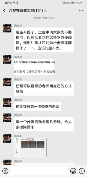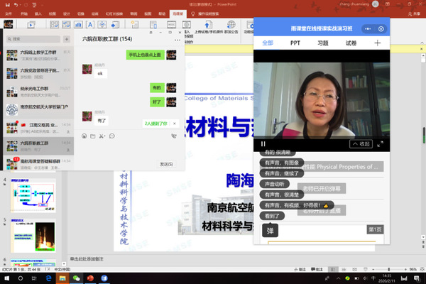 2月9日、10日,学院教学院长陶海军连续两天在教职工微信群里进行了图文培训,分别教授大家如何在南航精品课程平台上建立课程,如何安装注册使用雨课堂。截止目前,我院已在校精品课程平台完成新建课程60门,63位老师绑定雨课堂。