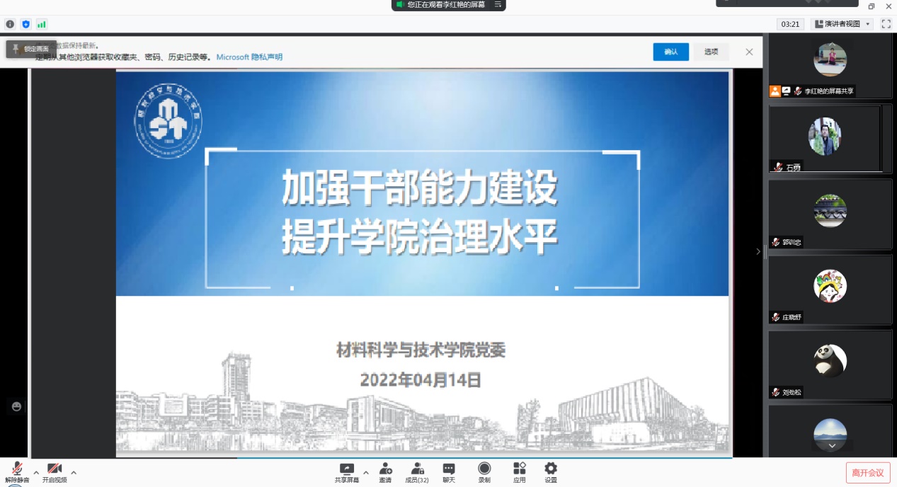 疫情校园封闭管理期间,学院领导班子克服困难,迎难而上,带头行动,担当作为,用新思路新形式积极推进年度重点工作的落地落实,下一步学院将围绕校史院史、作风建设、管理效能、沟通技巧和心理调适等内容分批次、分阶段持续开展培训,不断提升院系干部想干事、能干事、干成事、不出事的能力,带领全院师生,共同奋力书写学院改革发展和一流建设的新篇章!