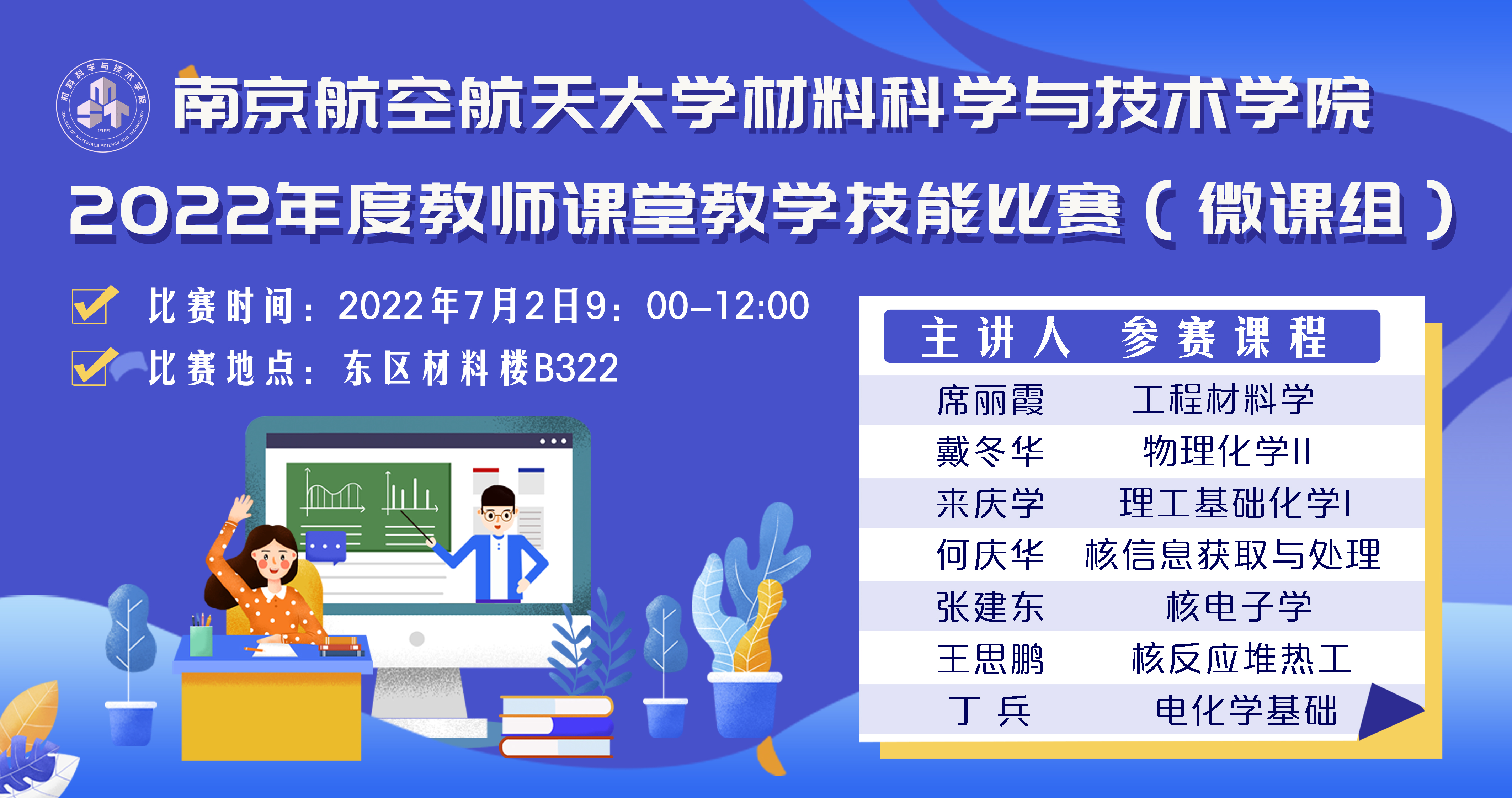 经过激烈角逐,材料加工工程系戴冬华老师、材料科学系丁兵老师、核科学与技术系张建东老师3位教师获得一等奖,将代表我院备战南航2022年微课教学比赛。