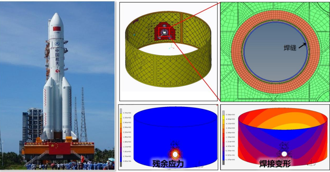 占小红教授团队参与了长征系列多型运载火箭贮箱焊接结构研制任务,开发了跨尺度一体化建模与仿真技术,形成了火箭贮箱焊接应力与变形全局高精度调控策略,实现了5米级贮箱焊接变形小于千分之一,助力长征5B运载火箭顺利发射。