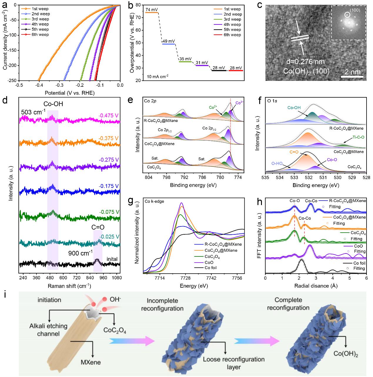 在1 M KOH中连续的LSV扫描诱导CoC2O4@MXene的过电位急剧下降。仅仅5个循环后达到了稳定的极化曲线,这表明CoC2O4@MXene具有快速重构的特性。In-situ Raman和HRTEM进一步揭示了由CoC2O4@MXene到Co(OH)2@MXene的完全重构过程。此外,XPS和XAS分析结果显示原位重构形成的Co(OH)2呈现出低价态富缺陷的结构特征,这与经典方法制备出的Co(OH)2具有极大的不同。