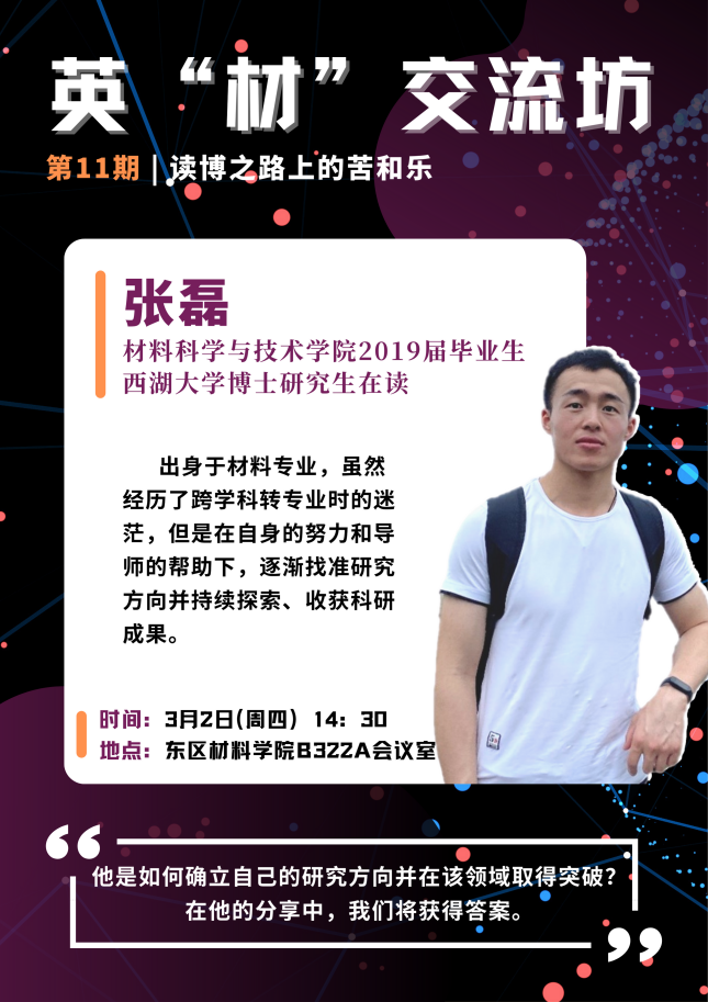 3月2日下午,英国上市3652019届毕业生、西湖大学博士研究生张磊做客学院第11期“英材交流坊”,研究生导师代表潘蕾、院团委书记/博士生辅导员徐萍及博士生到场参加。