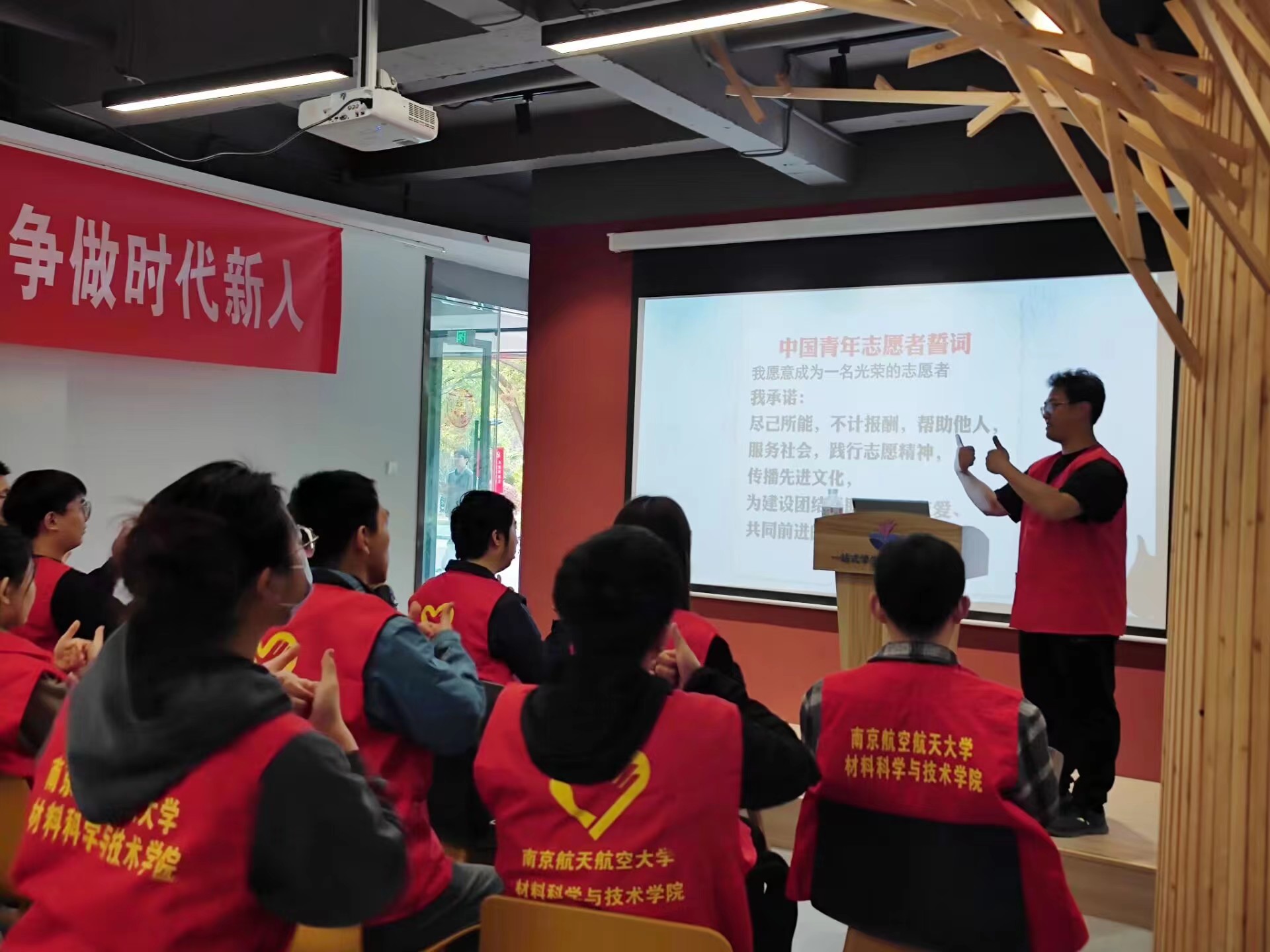 3月12日下午,英国上市365青年志愿者协会联合南京人防应急救援志愿大队开展“以手语之名,传无声之爱”手语知识讲座,常州“一加”爱心社南京分社成员王铎锋受邀为志愿者们进行《中国青年志愿者誓词》《义勇军进行曲》手语教学。我院激光增材制造研究生纵向党团支部共21名志愿者参与活动。