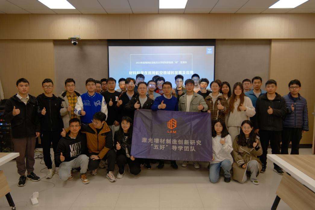 胡凯明回忆了在南航的点点滴滴,对材料学院老师们的辛勤付出致以衷心的感谢;随后介绍了自己所在的上海商飞公司研制的第一架国产大飞机C919,指出增材制造在民航领域有不可忽视的作用。最后,他分享了自己的工作体会,并对学弟学妹们给予就业方面的指导,告诫大家学习期间一定要对自己负责,加强学习主动性。互动环节,同学们就科研、就业、生活等方面积极提问,交流氛围活跃。