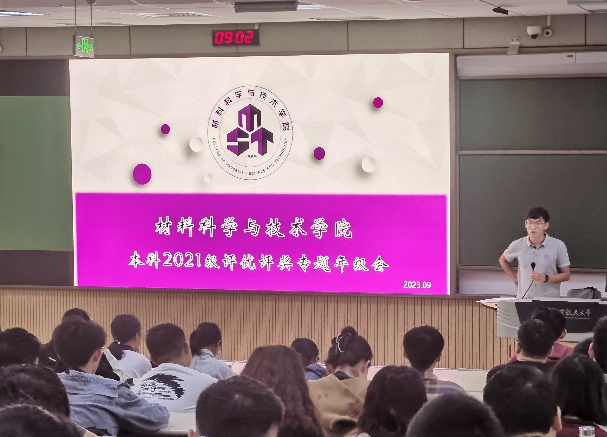 会上,各年级辅导员围绕评优的意义、评奖的类别、评选的原则、评定的办法四个方面进行阐述,重点对评优评奖的专业知识学习评价、实践项目评价、核心能力评价三个模块进行了解读。倪永谦鼓励同学们“以德为先,以勤为径,以本次评优评奖为契机,做学业路上的前行者,做学问路上的‘潜’行者”,刘召阳寄语同学们“勇于争先,敢于评优,守全面发展初心,担材料英才使命”。
