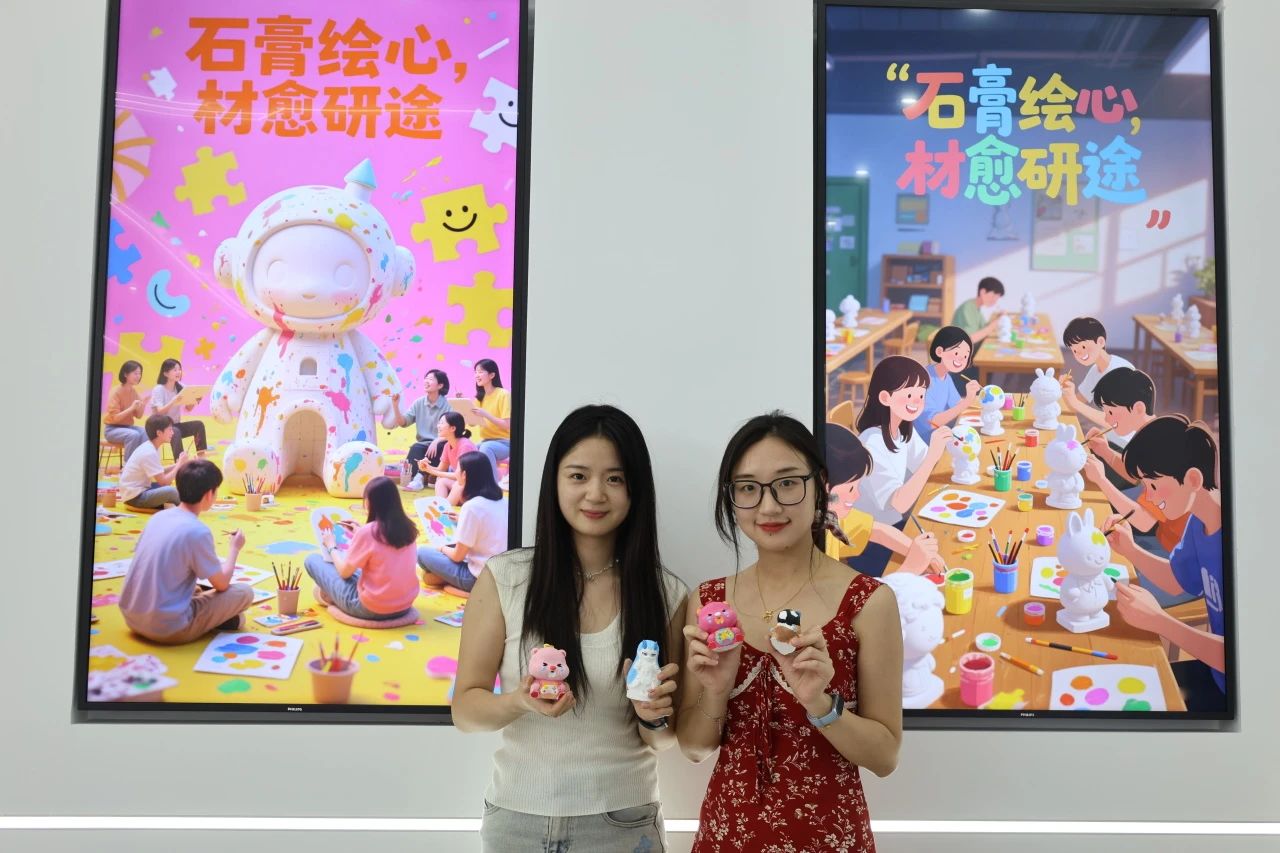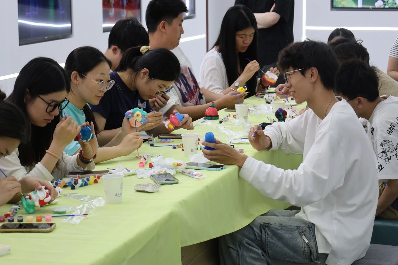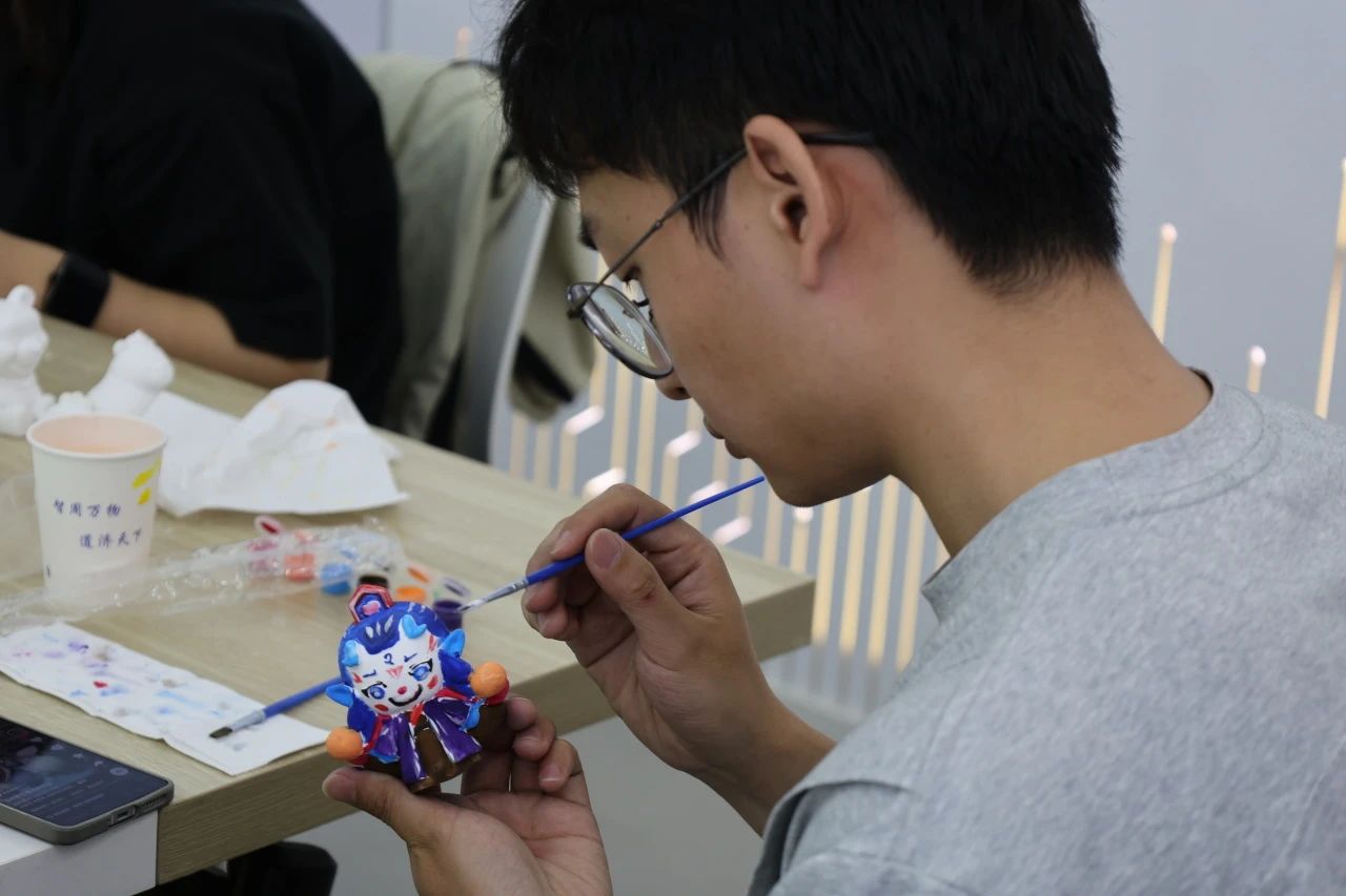 同学们为挑选的石膏娃娃进行绘制,选色、调色、上色,每一步都充满了挑战与乐趣。每个人都沉浸在创作之中,通过色彩选择和图案设计释放情绪,在专注绘画中感受“心流”体验。