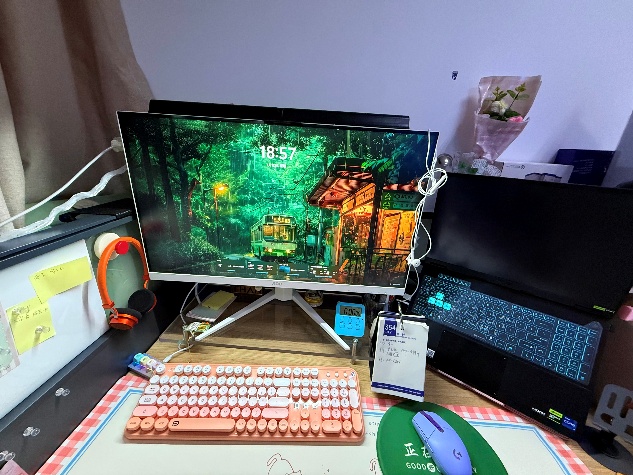 我的工位主打“实用+治愈”,双屏联动提升效率,粉粉嫩嫩的键盘配着森林壁纸,软乎乎的坐垫和鼠标垫缓解久坐疲惫;水培兰草和仙人掌负责净化空气,累了就看看它们,让我在忙碌里也能拥有一份松弛感。